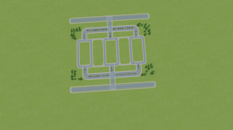 Three 8×24 blocks with 2-way 2-lanes around them feeding into 4-lane collector roads, which lead to the 6-lane throughway. The 3 main blocks are connected by pedestrian paths.