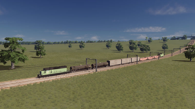 A mixed freight train to supply your local industry. It consists of a mix of tank, box and gondola cars, with a caboose at the back. The engine is a bit of a mix between the GP28, GP38 and GP40, in a Burlington Northern livery.