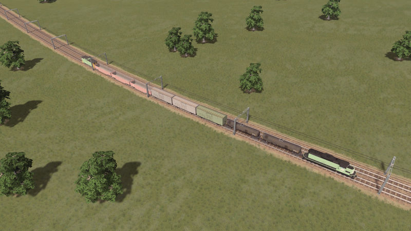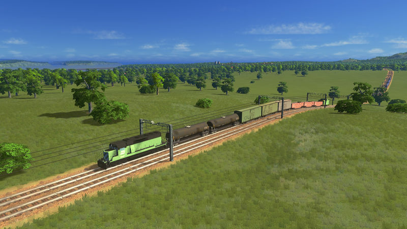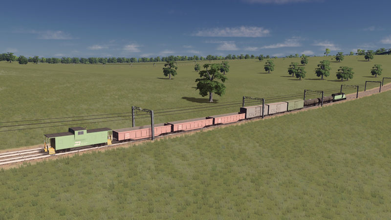 A mixed freight train to supply your local industry. It consists of a mix of tank, box and gondola cars, with a caboose at the back. The engine is a bit of a mix between the GP28, GP38 and GP40, in a Burlington Northern livery.