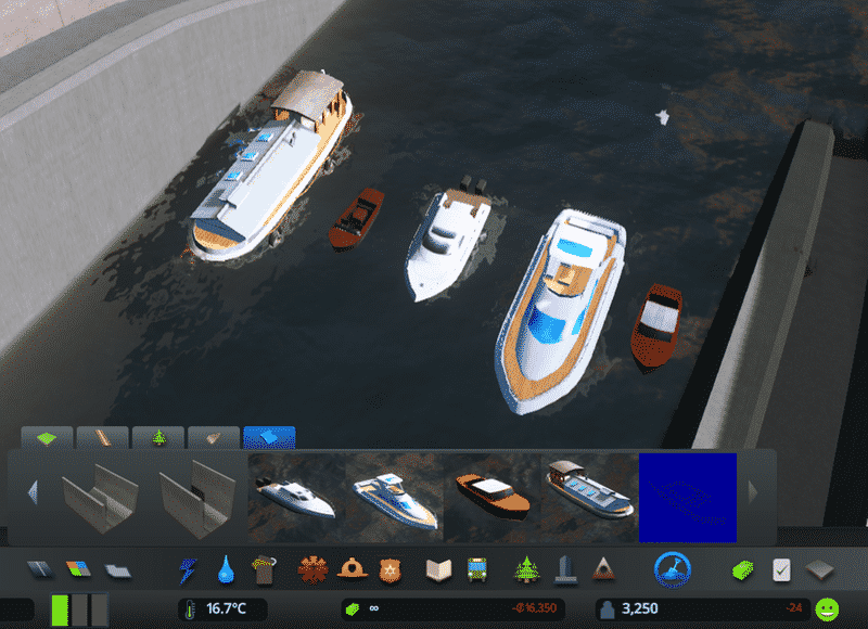 Each boat is an individual decorative building that can be found in Landcaping->Water Structures panel. This pack contains 5 boats: