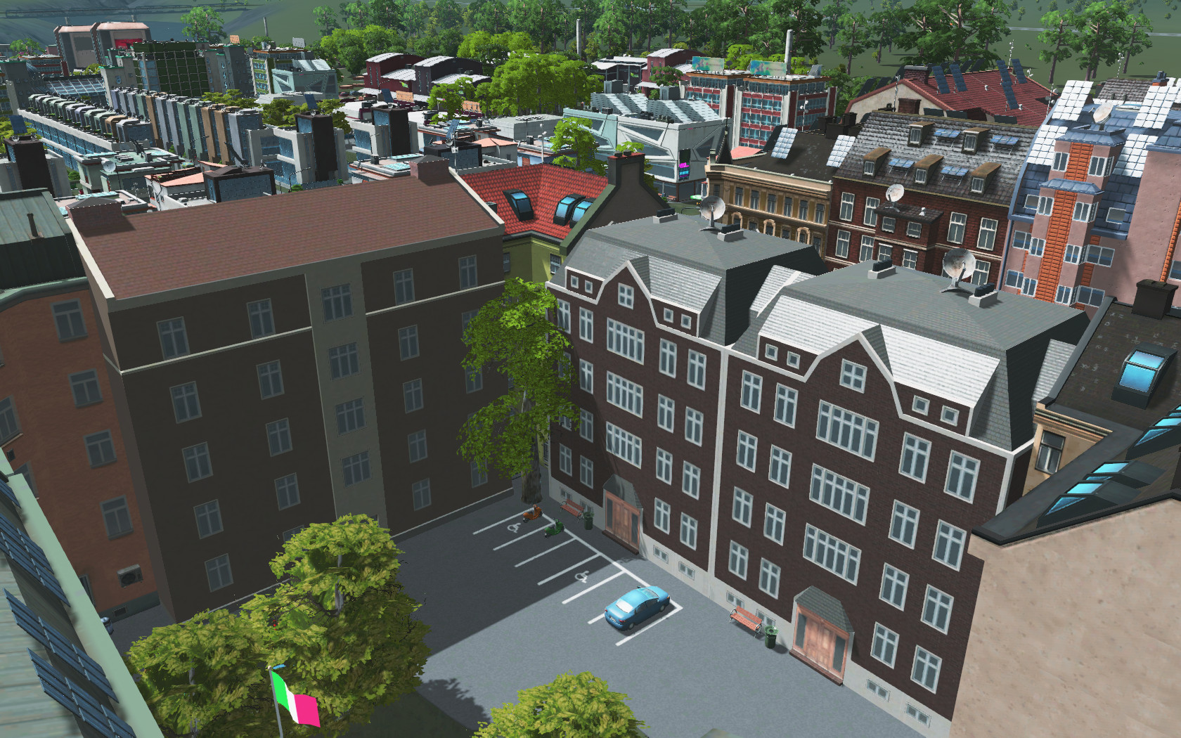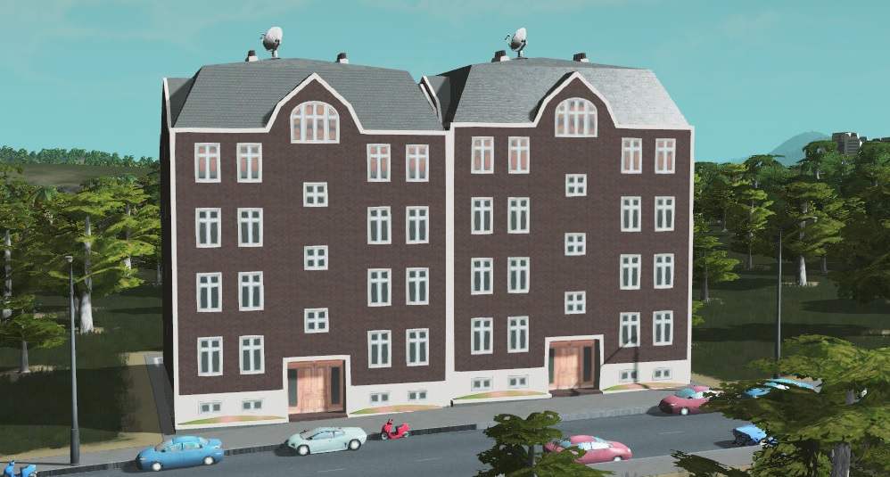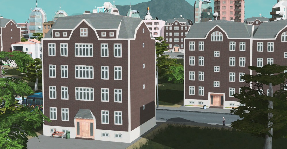 As my generous sprinkling of services was making every corner of my city eventually feature the same level 5 skyline, I decided it was time to learn 3D modelling. The result are in: three classically styled buildings for your VIP Cims. This one is a level 5, high density residential apartment building (for lack of medium residential zoning…). Works equally well built wall-to-wall or as a solitary. Grows on 2×2, 2×3 and 2×4 lots.