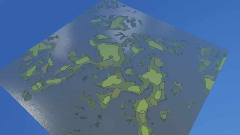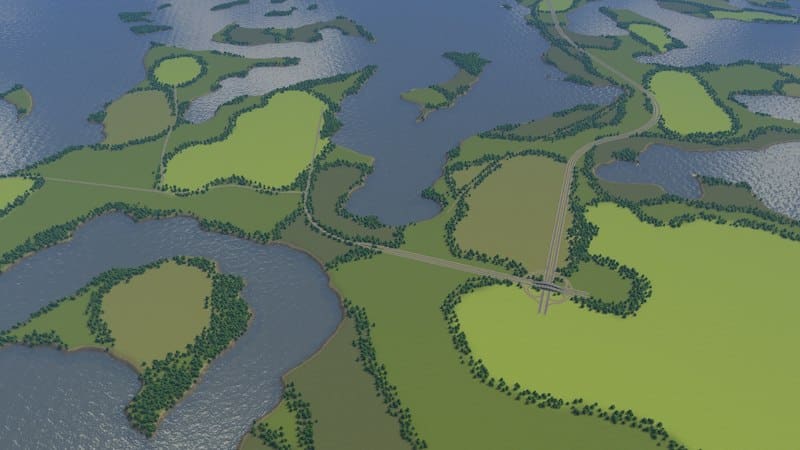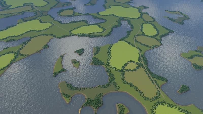 is a fictional map with flat terrain. There are a few winding inlets with shipping lanes, all the way to the center of the map. Resources abound, including trees (all vanilla). The archipelago is mainly in the center of the map, the roads are unfinished because there are a number of possibilities, and I thought I’d leave it up to you to decide how to handle that. Decoration goes all the way to the edges of the map, so you can enjoy this with the 81 Tiles mod.