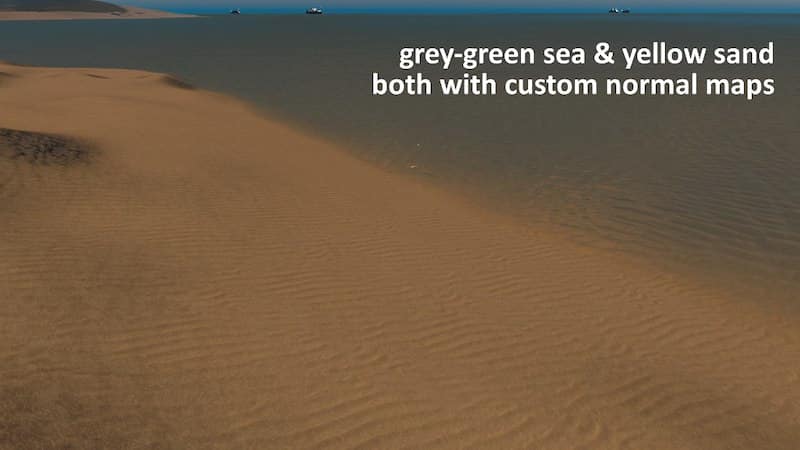 This is a theme I created to try and reproduce the look and feel of the British Isles. Olive green grasses, pale yellow sands, cobbled pavements that are terrible for walking on and our much beloved grey/brown/green North Sea!