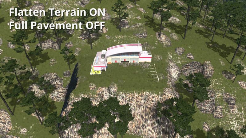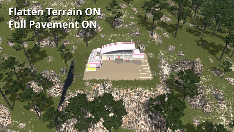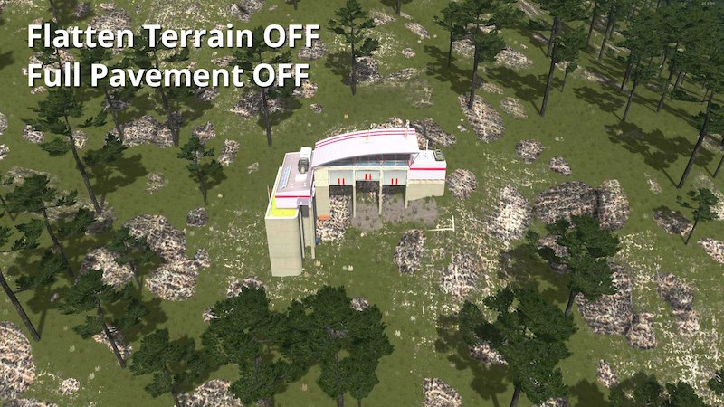 The same goes for FlattenTerrain and the other options. You can only have one configuration per asset. Pick if you want this specific building you’re setting to flatten terrain or not, to have pavement, gravel or none, and leave it like that from now on. If you set something with flatten terrain off, then you change it to on and place it somewhere else, it won’t be immediately apparent. but they will both have changed to flatten terrain on. The reason you don’t see it right away is because terrain needs to be updated near the first building before the changes appear. But next time you load, they will all have flatten terrain on.