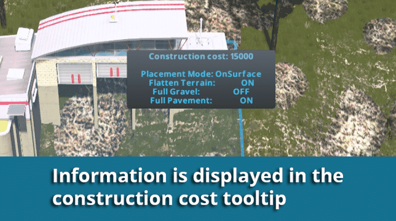 - Placement mode and other information is displayed in the Contruction Cost tooltip. Customize display info in options menu.