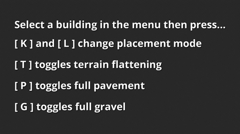This way you can place buildings before you place roads, you can place buildings in water, or on steep terrain, you can place buildings that are meant for water on land, etc etc etc. You get the idea.