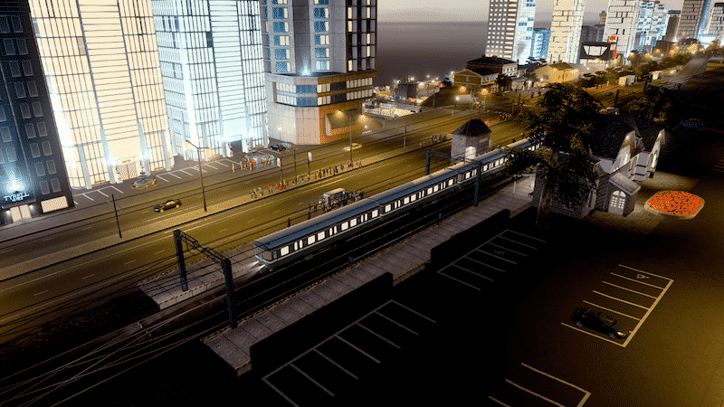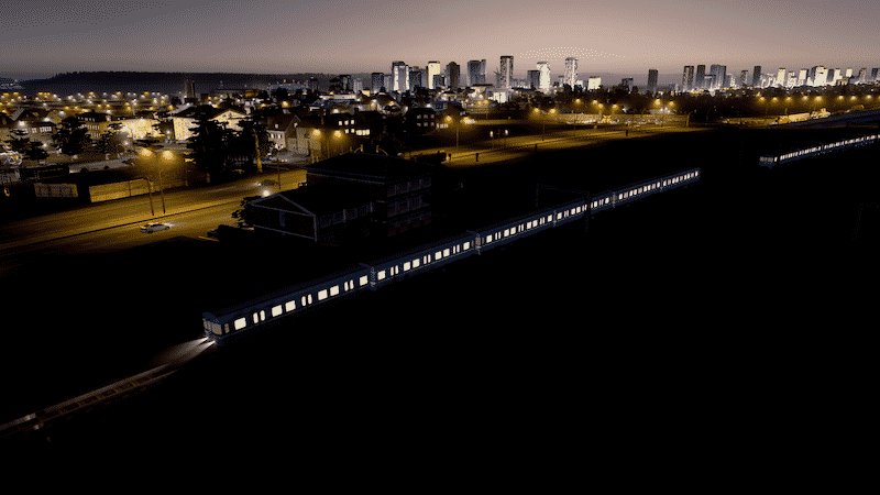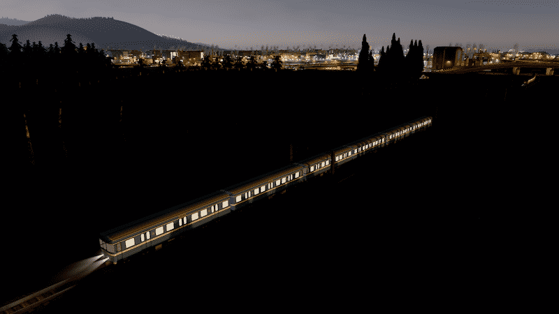 Only the engine (first car) will have headlights and red tail lights. You can use the IPT – Improved Public Transport mod or the Advanced Vehicle Options (AVO) mod to replace the last car with an engine in order to get headlights and tail lights on the last car as well.