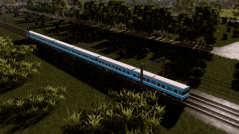 The train is line colarable with a white stripe running along the sides of the train. Use a blue line color to get the real world livery.