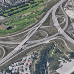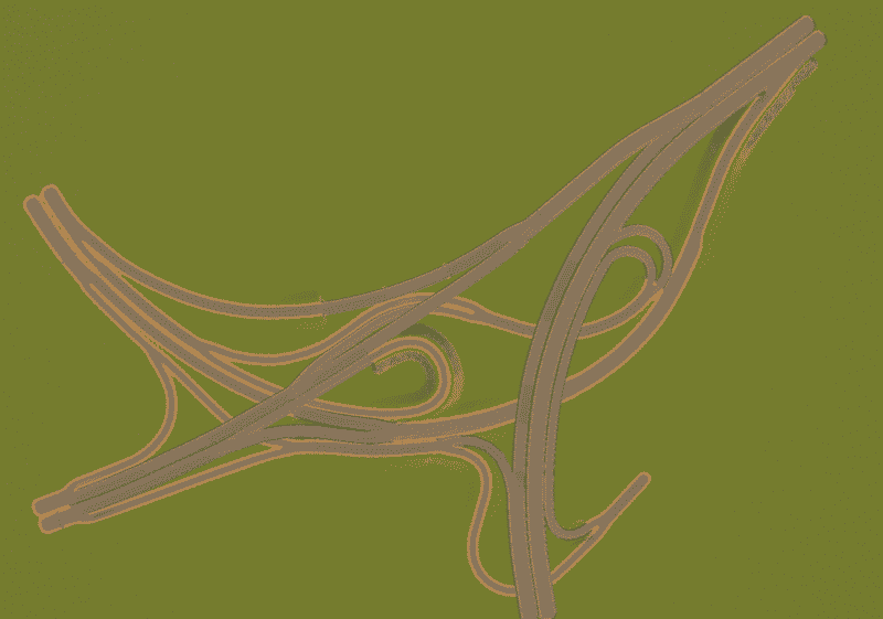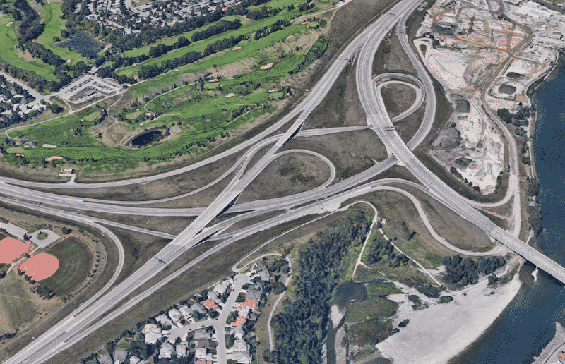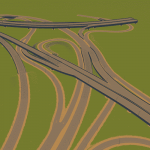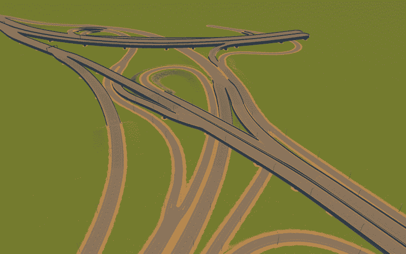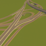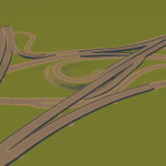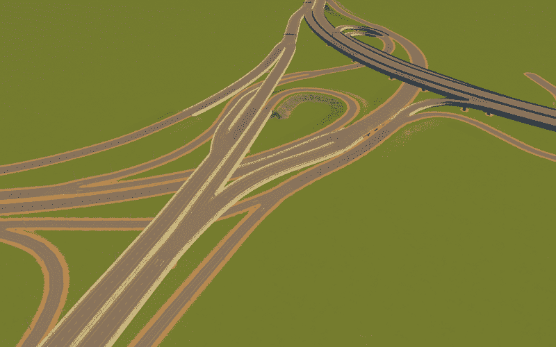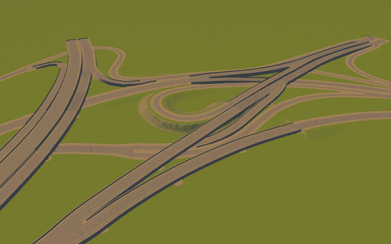 While this functions like a 4- way highway interchange, in real life this is just an extremely overbuilt exit that connects two local roads to one another and to Calgary’s Deerfoot Trail highway. Luckily, this exits is so extremely overbuilt that it really is just a 4 way highway interchange. Make sure that there isn’t a lot of traffic going through either direction of that random national road in the top right of the first picture. Cars MUST weave across lanes in both directions, so if its too heavily used this interchange could get a little bit clogged. In real life that national road would just be a dirt road that ONLY serves a concrete manufacturer, so let that inform the kind of volume that could be flowing through there. I’d maybe put services like trash and deathcare off of it, but whatever. I thought it looked pretty rad, so here you go. Enjoy!