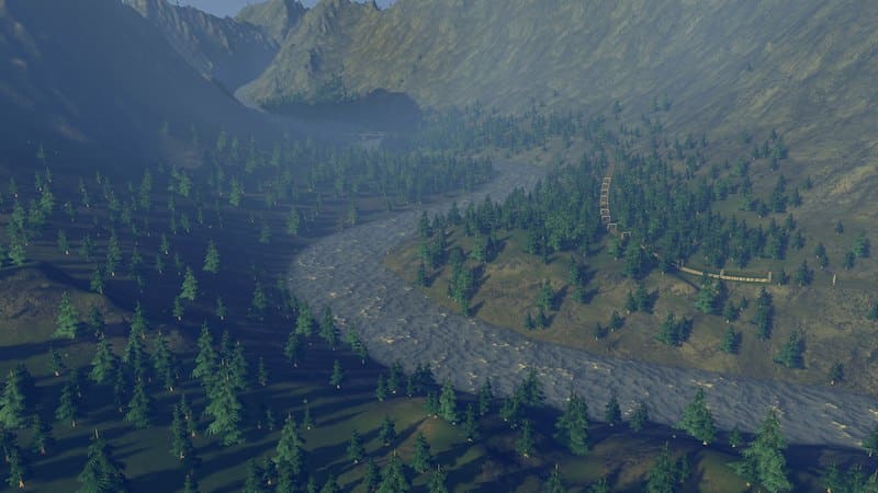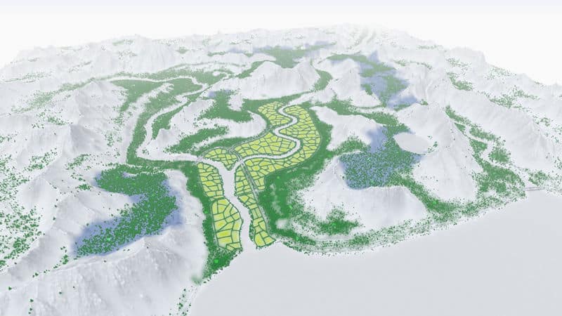 There are several rivers on the map. However, the water level in each one is quite low. Building dams or too many pumps will not end well. The water to support large populations can safely be taken from one of the mountain lakes.