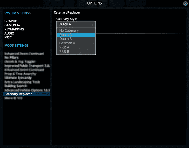 The mod will include several ‘Styles’ you can choose from in the Mod Options. You can change this in-game. The mod will then replace all vanilla props with custom props. Another option is to remove the wires completely. The styles are applied to all tracks, this includes vanilla Station Tracks, but also all tracks from Extra Station Tracks and One-Way Tracks. Until Network Skins is updated, you cannot change props per segment.