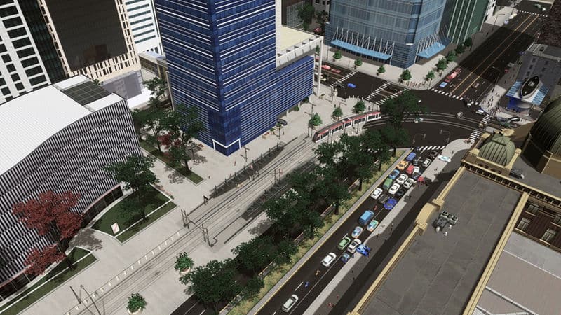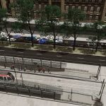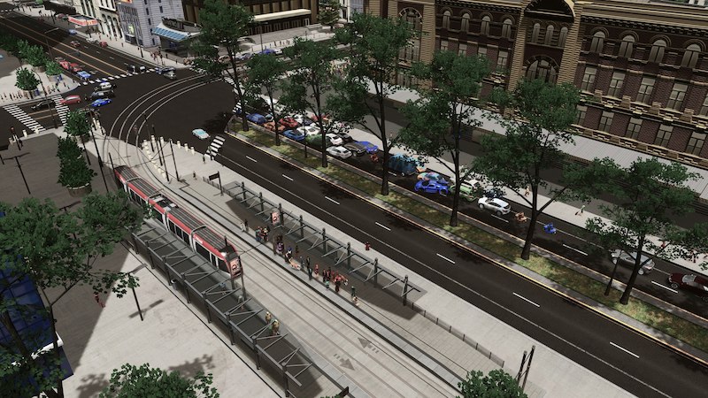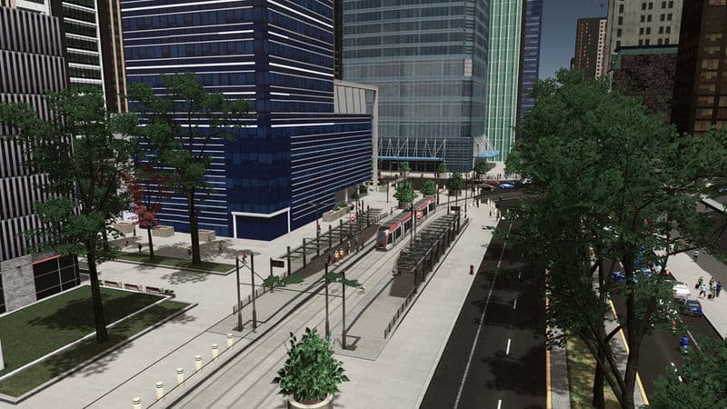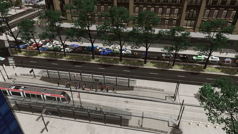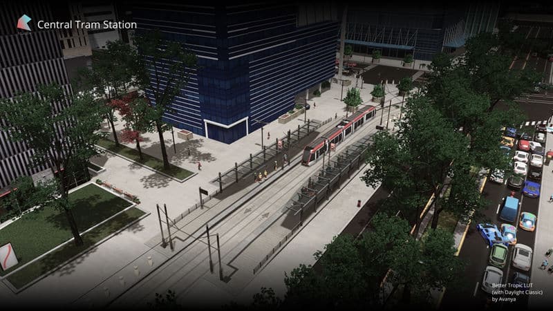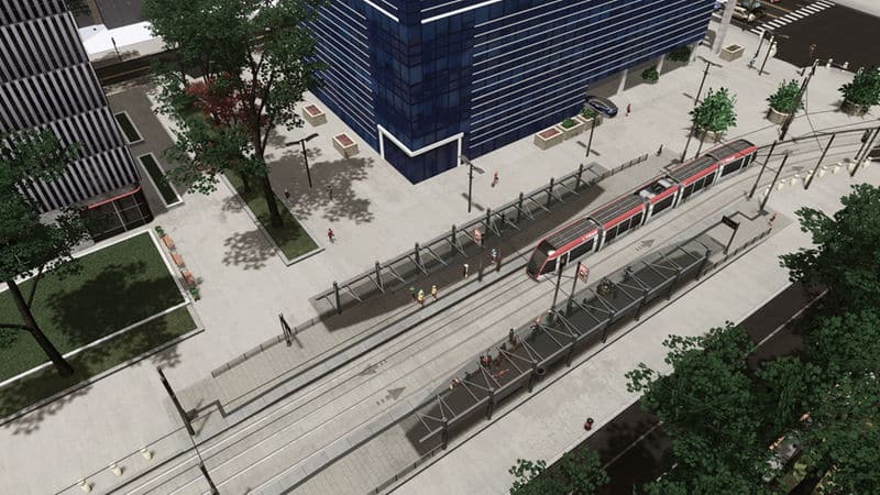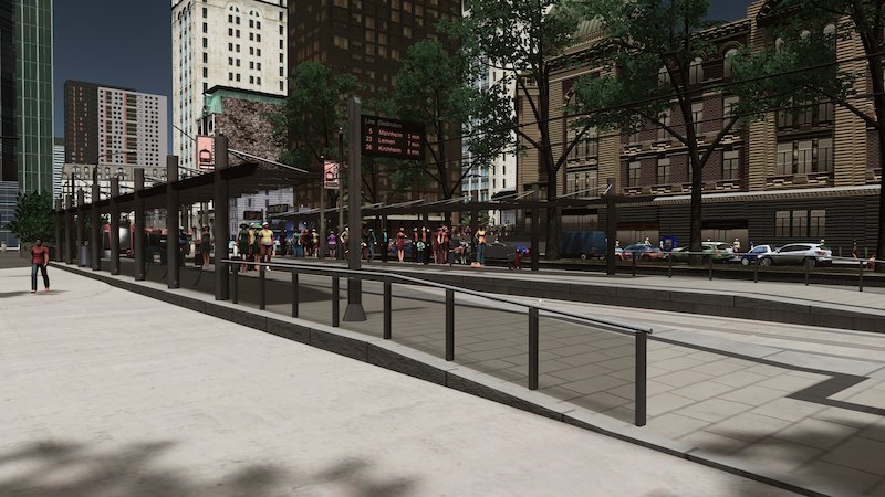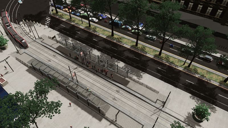 This tram station is perfect to handle lots of tram lines. It provides a long shelter for rainy days, a departure display and the increased platform height makes boarding easier. The station has a decorative function. You can find it in the Parks & Plazas menu under the Other Parks tab.
