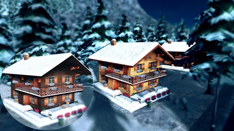 Chalet prop pack is required to have table set, window flowers and wood pile.