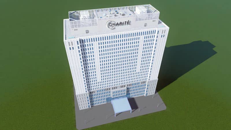 Berlin’s Charité Hospital “Bettenhochhaus” was completed in 1982 and was cleaned and renovated in 2016-2017. It is around 87m tall and Germany’s largest hospital. It dominates the skyline at the Mitte Campus, nestled right in the middle of the city near the Parliament and Central Station.
