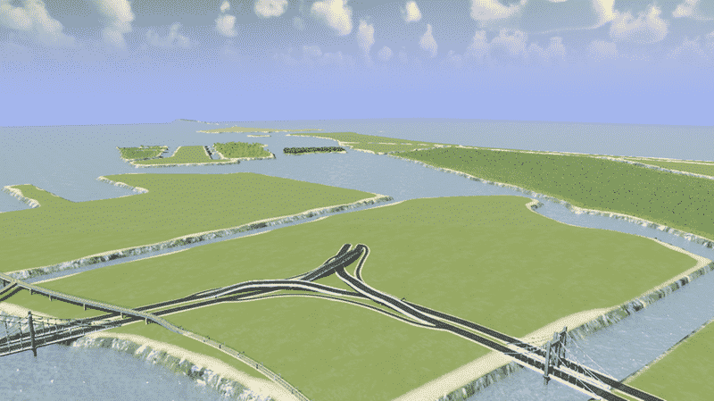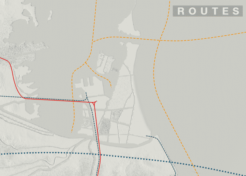 Outside connections are a highway, two train paths, multiple ship routes and a airplane way.