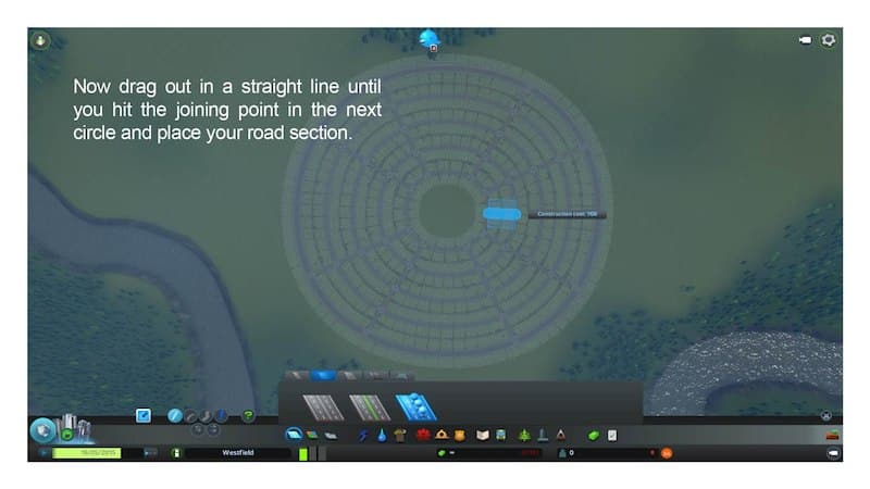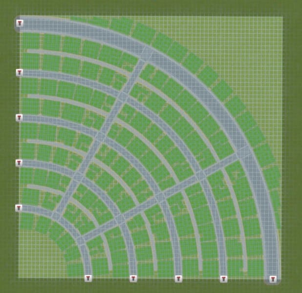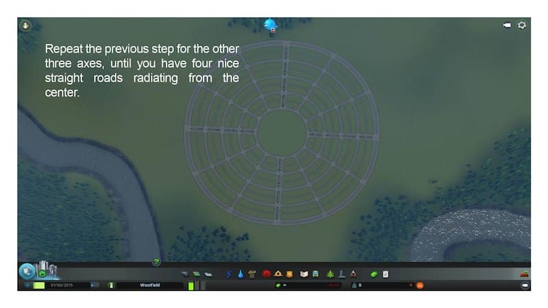 The finished product will be a 200 acre layout consisting of five concentric one-way road circles in alternating directions, connected by eight straight one-way roads, also in alternating directions. The outer road is a six lanes wide and the rest are two lanes. I recommend using four lane avenues to fill in the last four road spaces, as shown in the images.