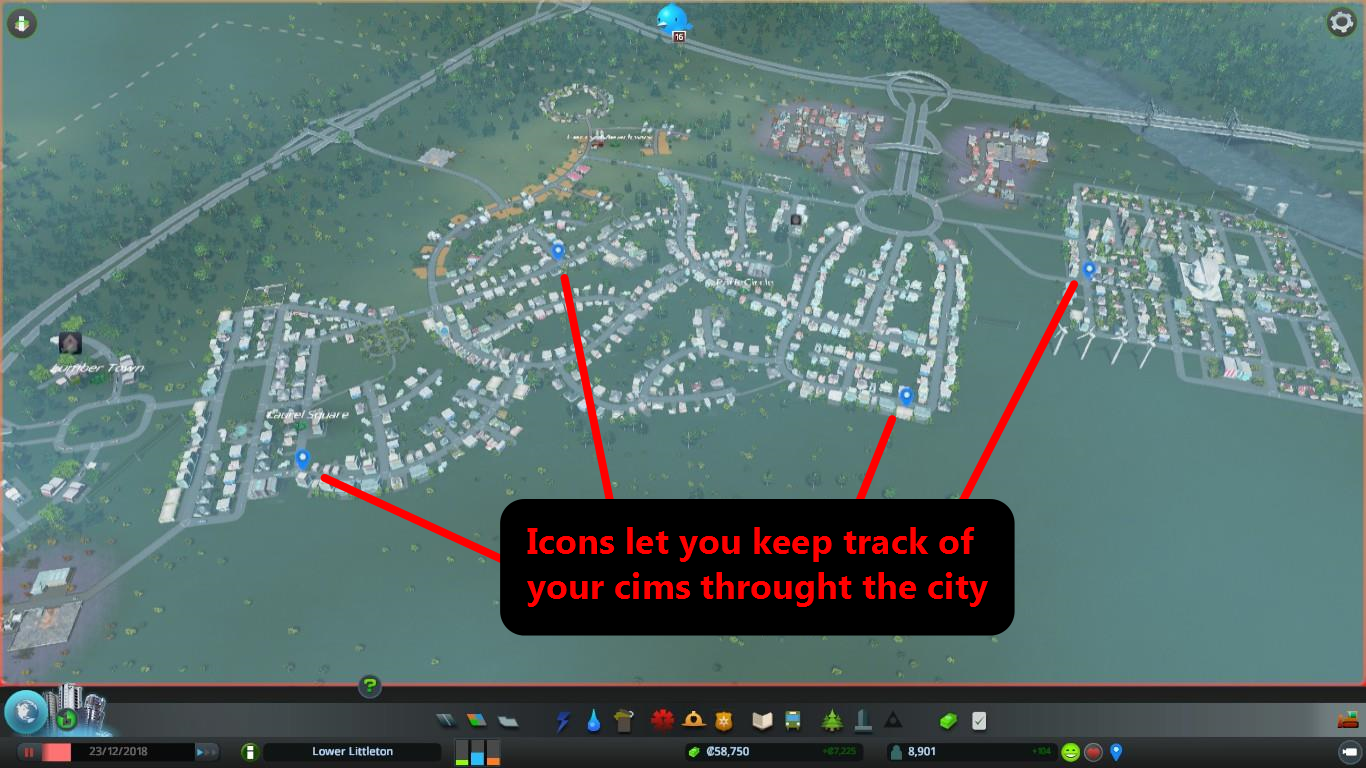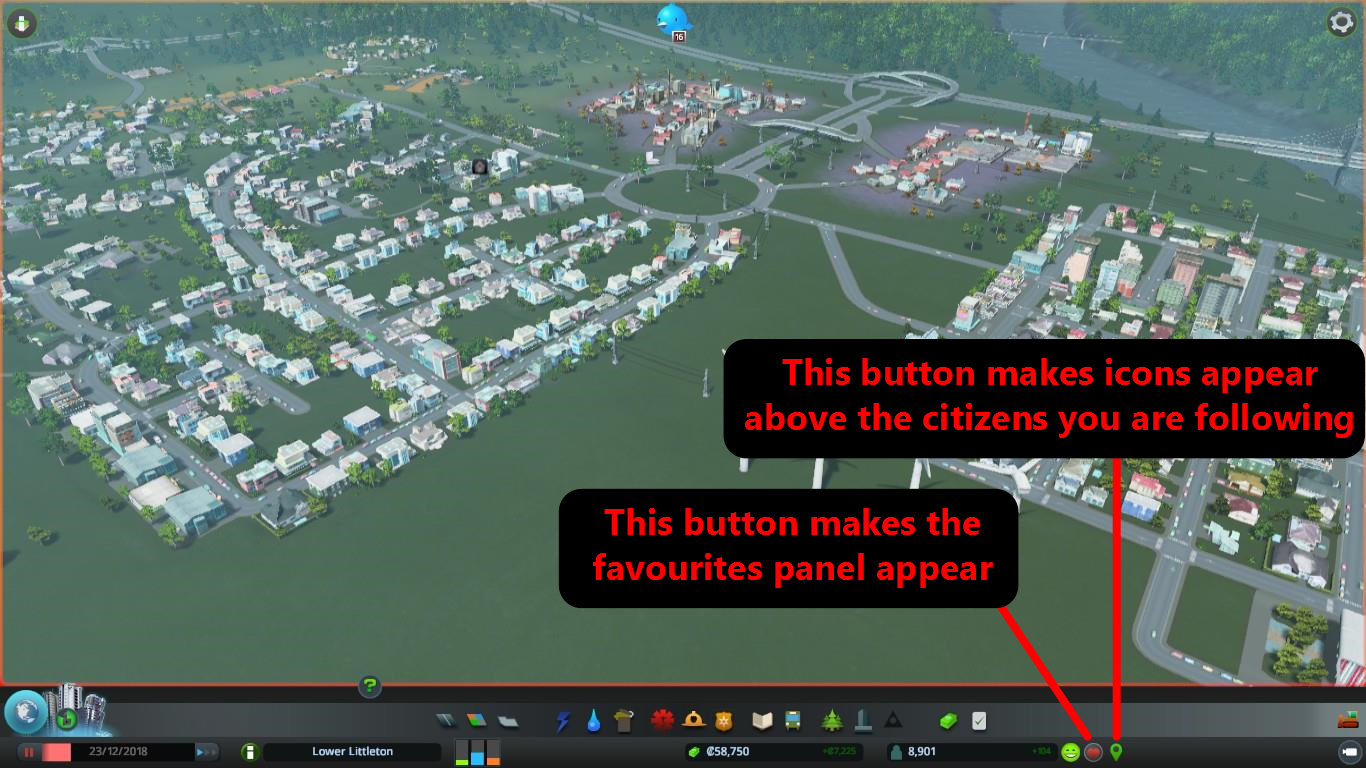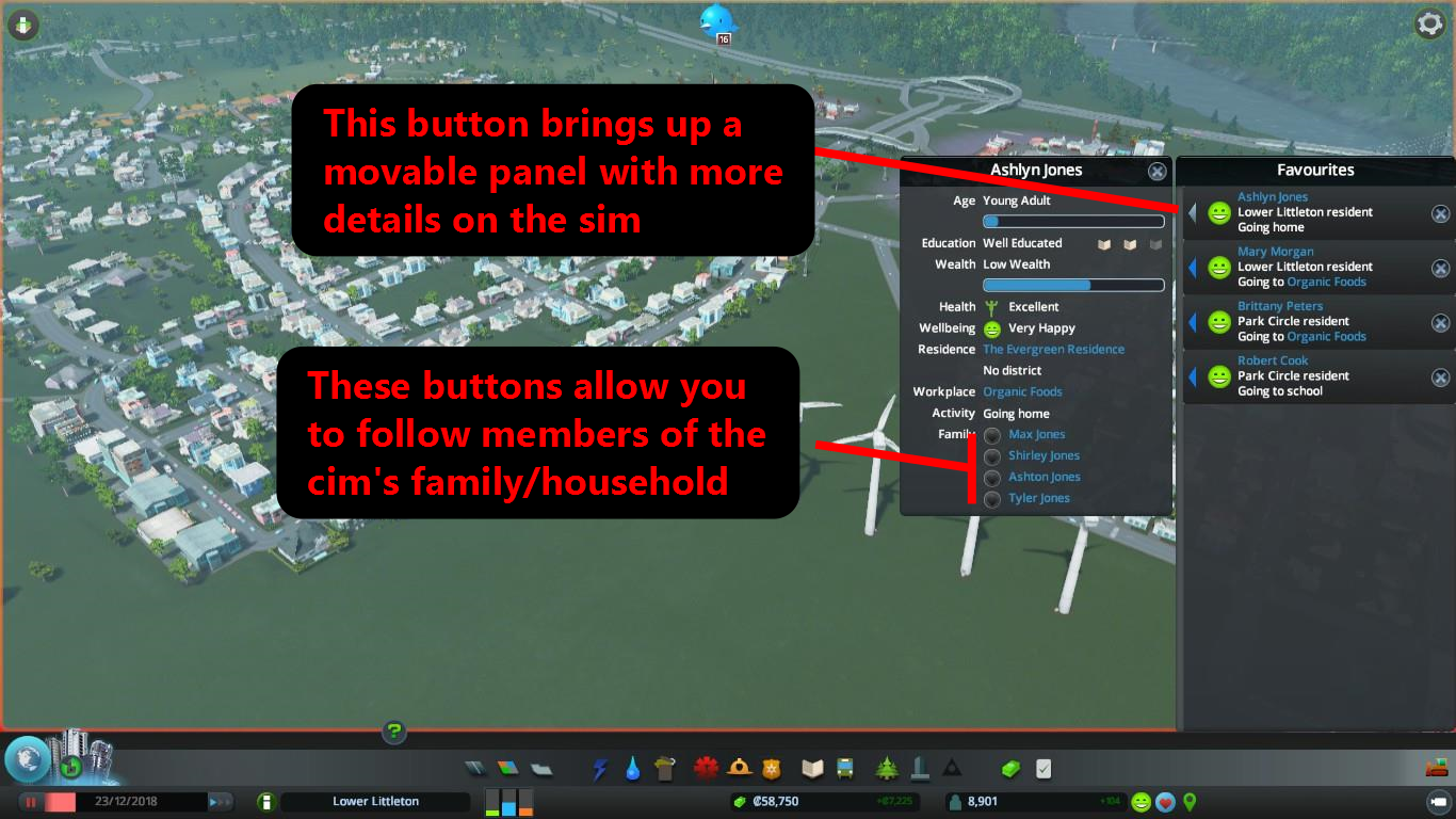When you click on a citizen, a new button allows you to follow them. The favourites button, beside your population count, brings up a list of all the citizens you’re following. You can click on their names to find them quickly, or choose to see a detailed view of their lives and who else is in their family or household. Another button beside the favourites button allows you to place icons above the heads of your Cims and track them throughout the town.