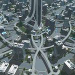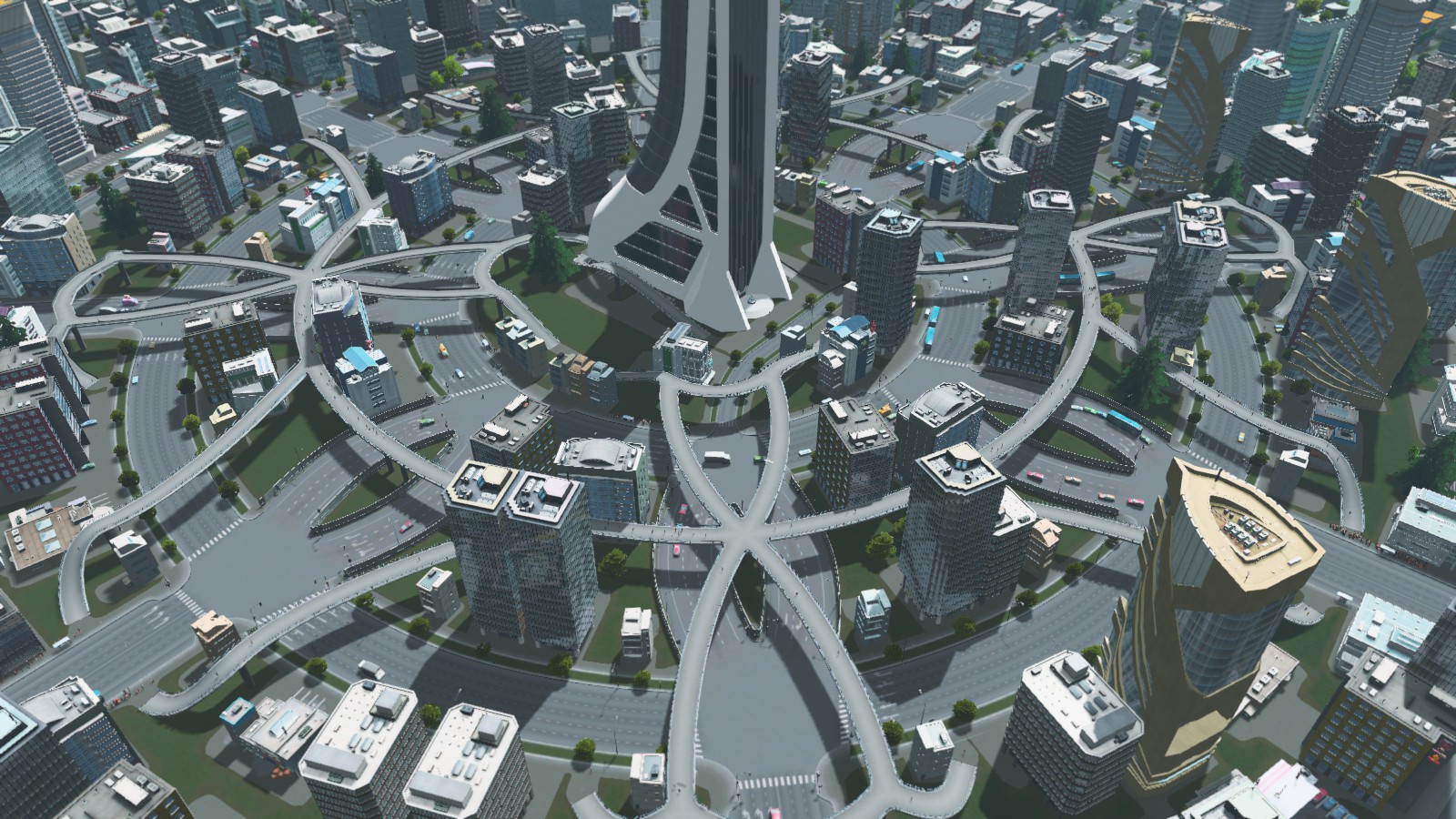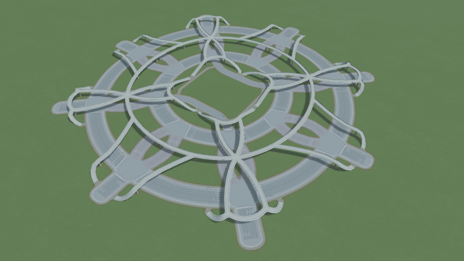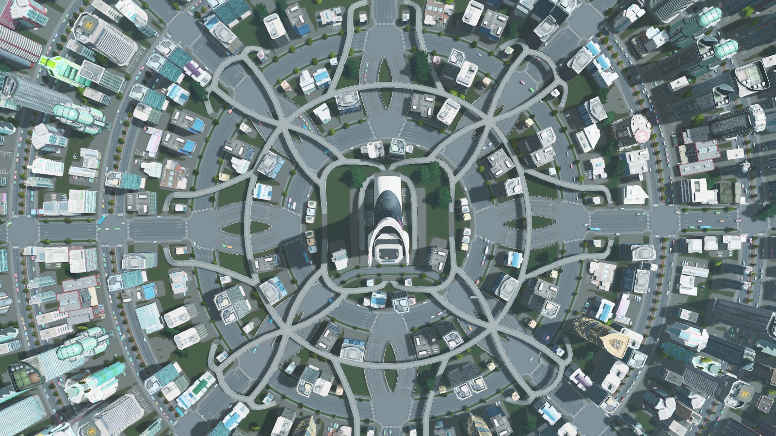 I am a big fan of the circular city design surrounding a large downtown area, and while some of the 8-directional roundabouts I experimented with looked nice, they weren’t quite what I was after. Either being too small or not having connected zone power between outer and inner sections.