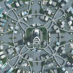 Surrounding the center area are two 6 lane, one way avenues that go around in opposite directions while a complex of pedestrian walkways allow access to various parts of the intersection to avoid the criss-crossing traffic.