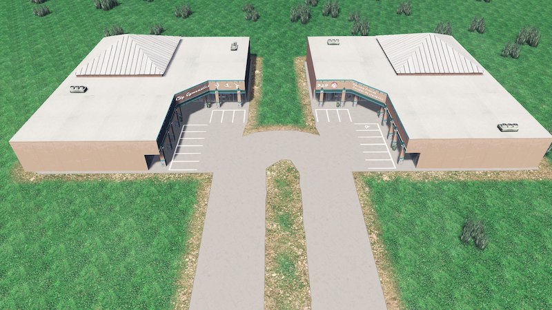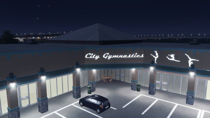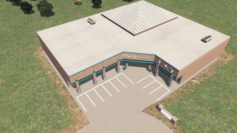 What would be perfect in a large retail space in the corner with a high ceiling? A gym for gymnastics of course! Inspired by a gymnastics gym in a shopping center in Houston but closed down and became a boxing gym I think.