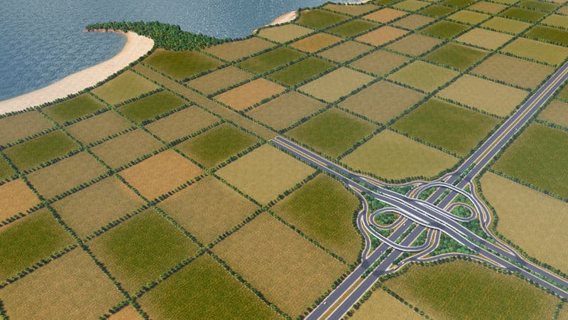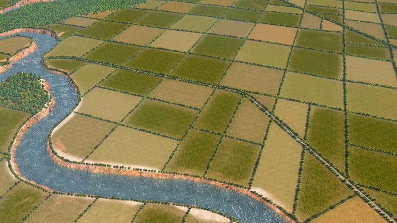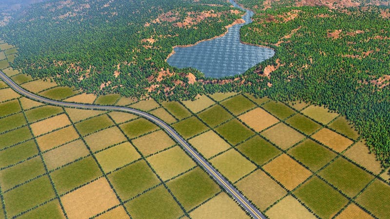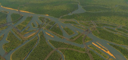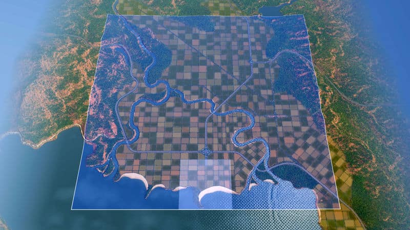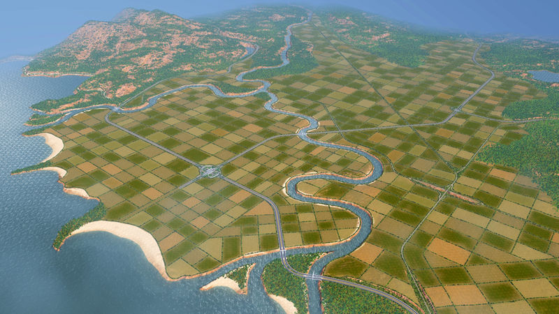 Clear Lake is a parcel of relatively flat land nestled between mountains and a large lake. It includes a couple rivers and a reservoir, highways and railroads, and of course lots of farmland. The starting tile and ideal location for a downtown is on the central piece of land surrounded by the rivers and lake. It’s mostly flat and perfect for building. The map is mostly based on data from a lakeside town in California.