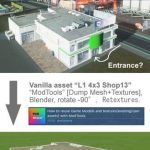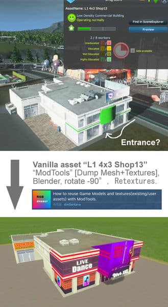 このビルはバニラの商業アセット「L1 4×3 shop13」をModToolsで書き出してモデルとテクスチャを改変したものになっています。むしろModToolsでのデータ書き出しを調べた事の副産物です。