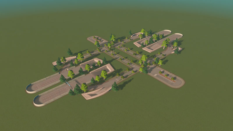 A compact highway-to-avenue interchange that works well in the middle of a large residential or commercial area. The traffic flow is handled underground.