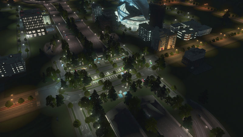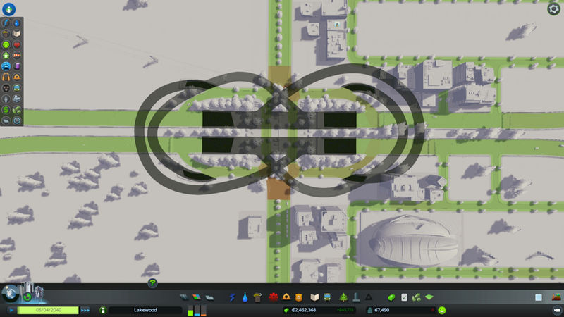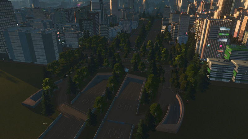 A compact highway-to-avenue interchange that works well in the middle of a large residential or commercial area. The traffic flow is handled underground.