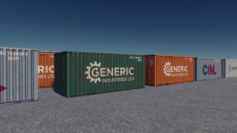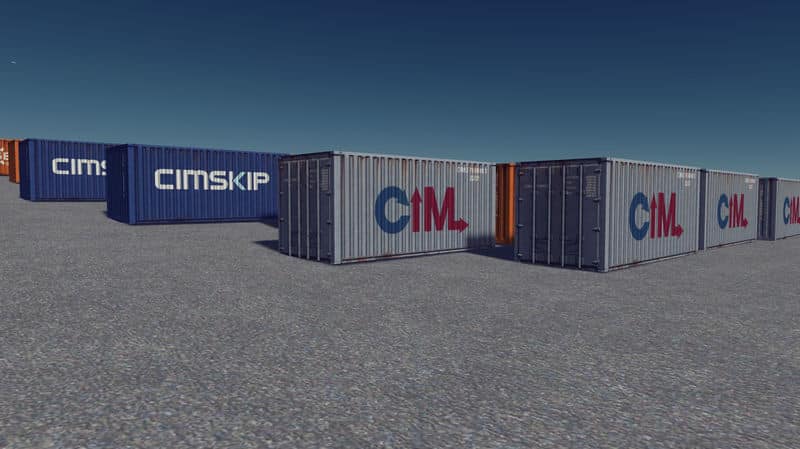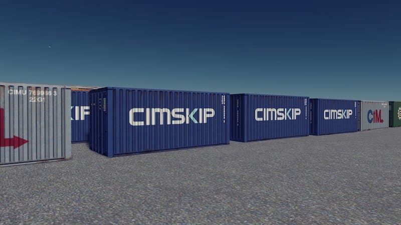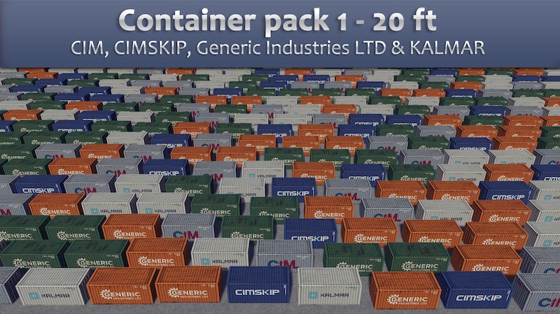 A pack of 20 ft containers including 5 variations of 4 brands, including Cargo in Motion (CIM), CIMSKIP (by Lee Towers), Generic Industries Ltd. (by Beardmonkey) and a new giant in the shipping business KALMAR.