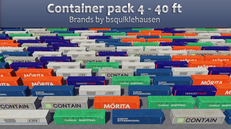 A pack of 40 ft containers with all your favorite brands by bsquiklehausen. Visit his workshop for freight trains and props matching these containers.