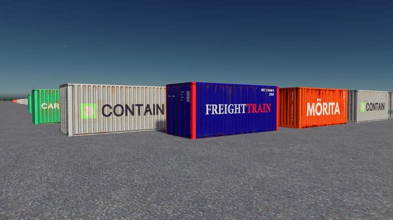 A pack of 20 ft containers with all your favorite brands by bsquiklehausen. Visit his workshop for freight trains and props matching these containers.
