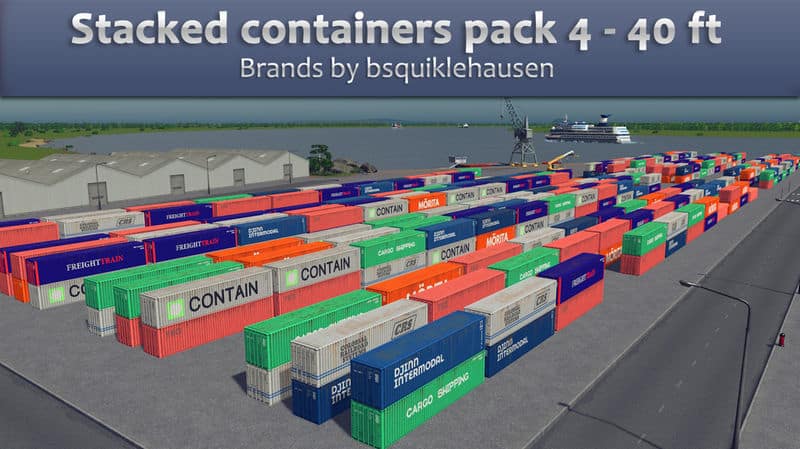 All the variations of this pack and the large container stacks 4 share textures, so make sure you have texture sharing enabled in the options of the Loading Screen Mod. This is more efficient than having several smaller textures for the different variations, so no need to worry about the filesize unless you’re running the game on a potato. ?
