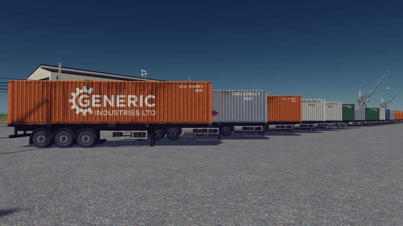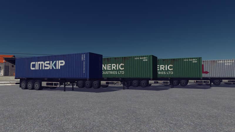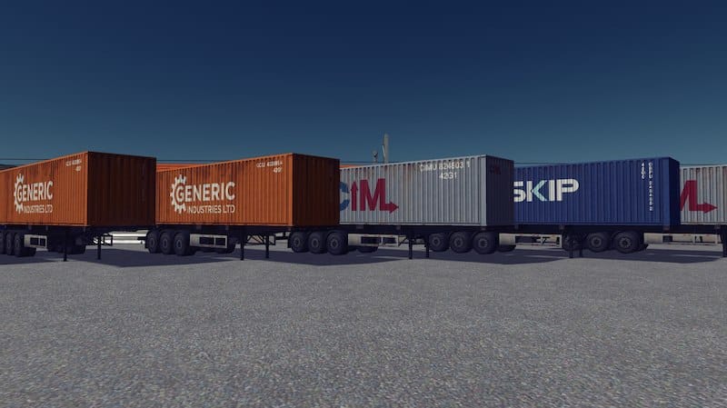 Containers on a trailer containing 5 variations of 4 brands, including Cargo in Motion (CIM), CIMSKIP (by Lee Towers), Generic Industries Ltd. (by Beardmonkey) and a new giant in the shipping business KALMAR.