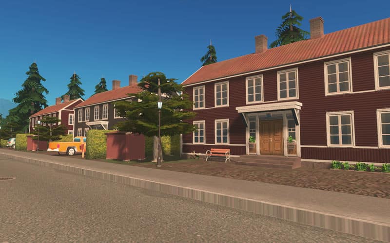 The county of Hälsingland is famous for its large, ornate wooden farmsteads. This building was inspired by a hälsingegård in Kalvhaga. I’ve never seen a hälsingegård that wasn’t red, grey, or white, and as this house looked rather boring in white it comes in two shades of traditional “falu” red and two shades of grey.