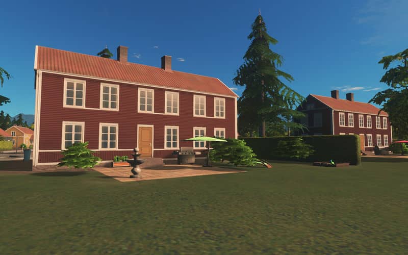 The county of Hälsingland is famous for its large, ornate wooden farmsteads. This building was inspired by a hälsingegård in Kalvhaga. I’ve never seen a hälsingegård that wasn’t red, grey, or white, and as this house looked rather boring in white it comes in two shades of traditional “falu” red and two shades of grey.