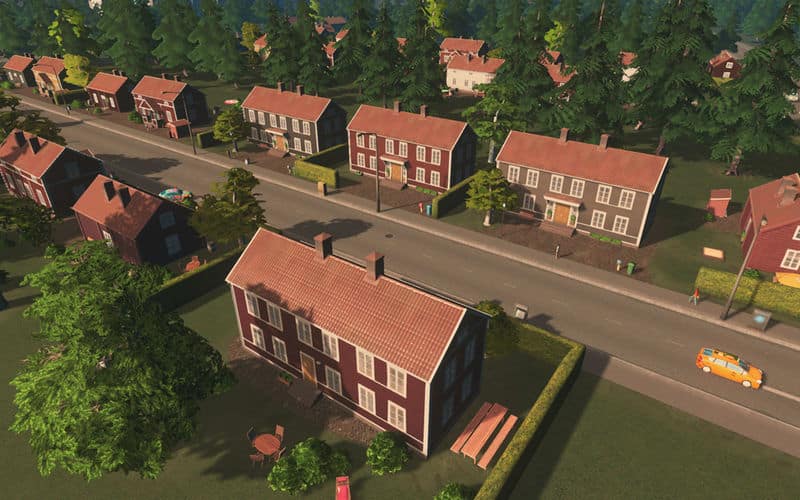 Randomly appearing props and trees are included, and windows are lit up at night.