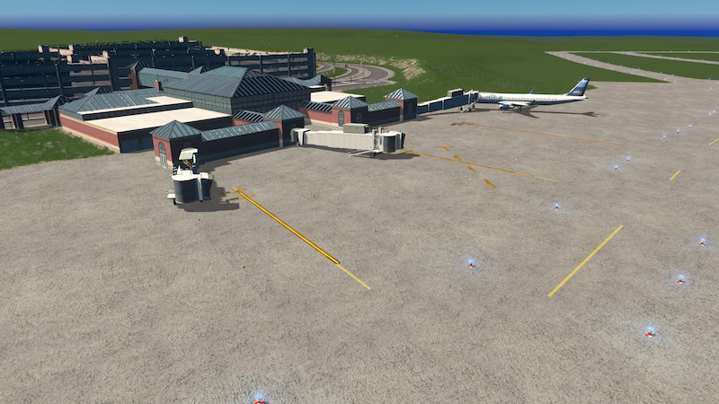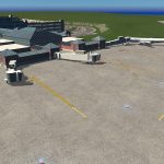 This building is functional and contains 3 airplane stops (can spawn 3 planes simultaneously). The airplane stops are positioned in the same way as the real airport (the one this is based off of). Additionally, a single jetbridge building is included as a sub-building.