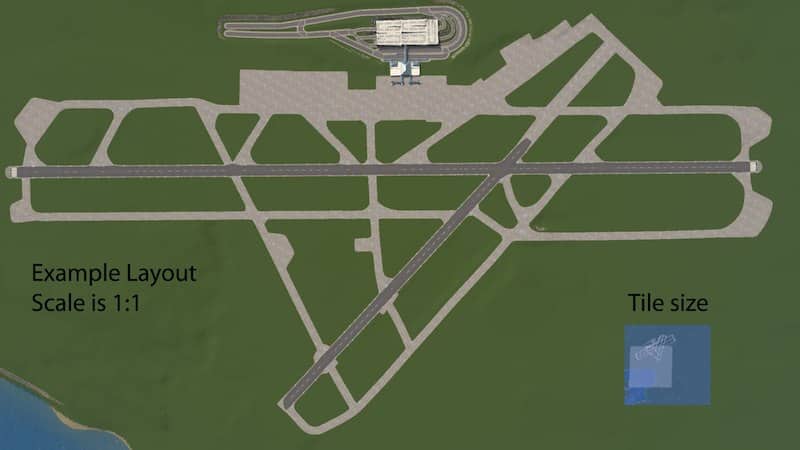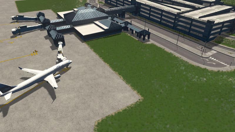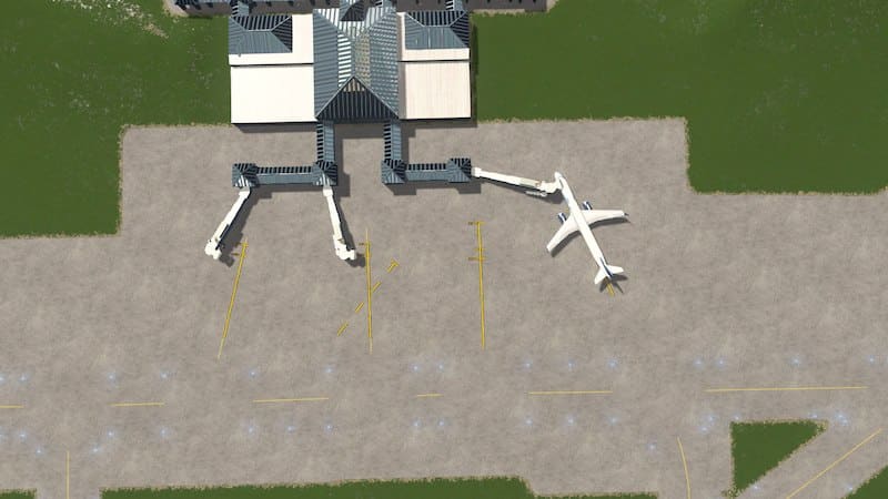 This building is functional and contains 3 airplane stops (can spawn 3 planes simultaneously). The airplane stops are positioned in the same way as the real airport (the one this is based off of). Additionally, a single jetbridge building is included as a sub-building.