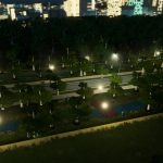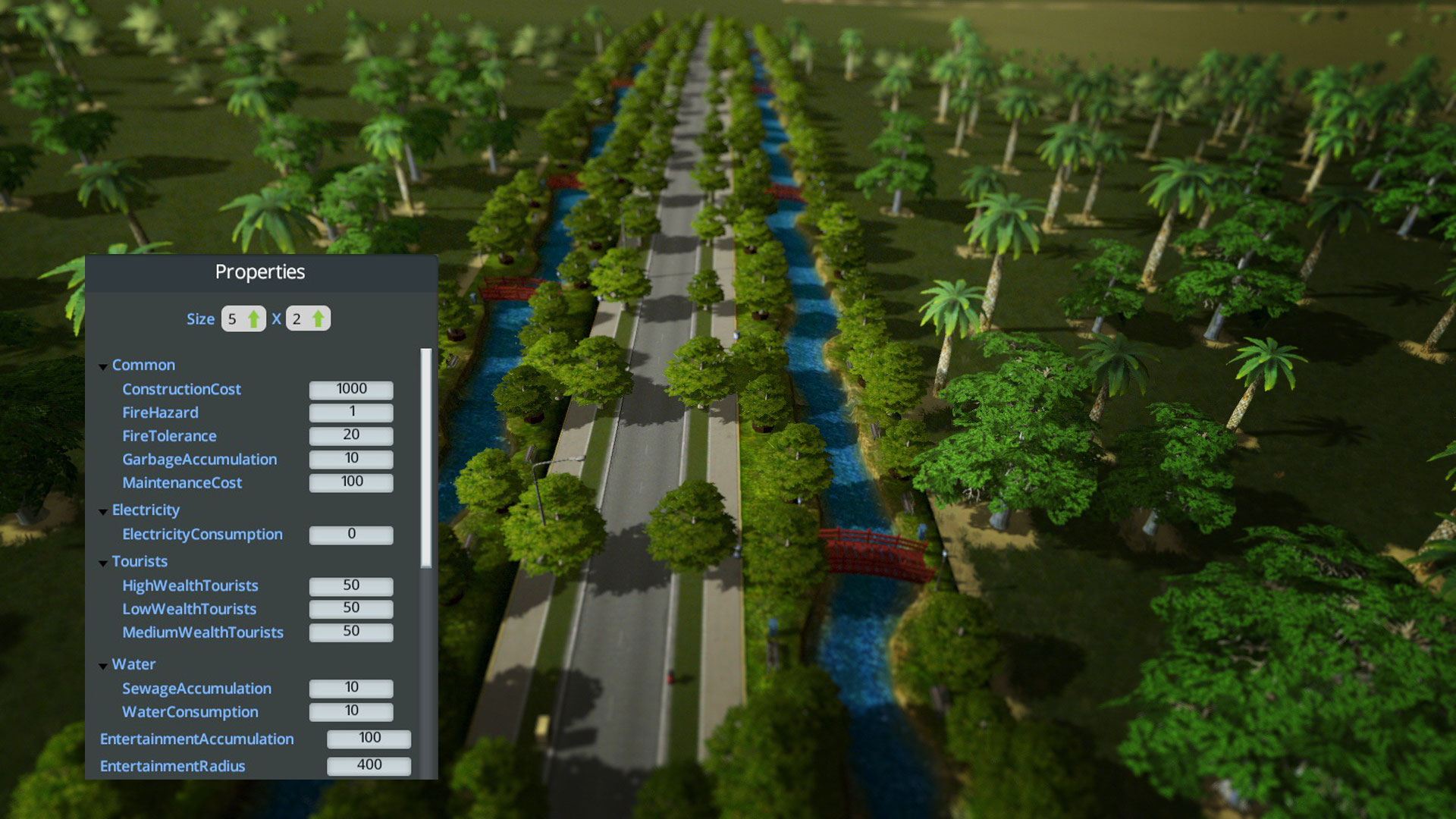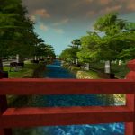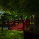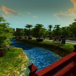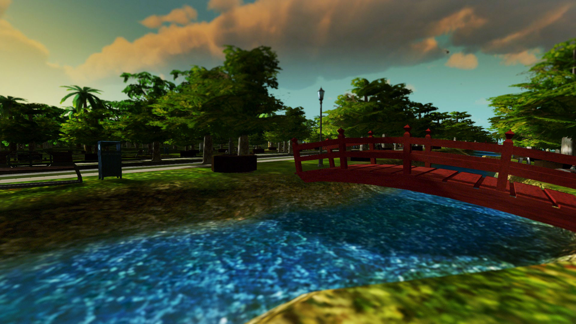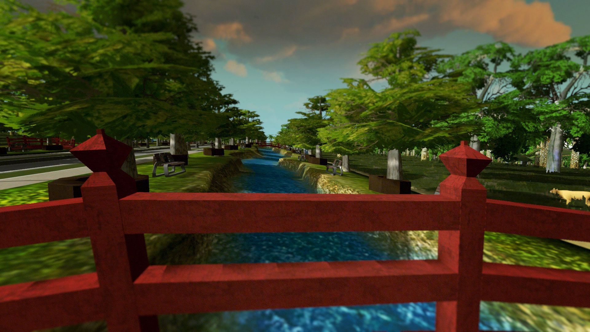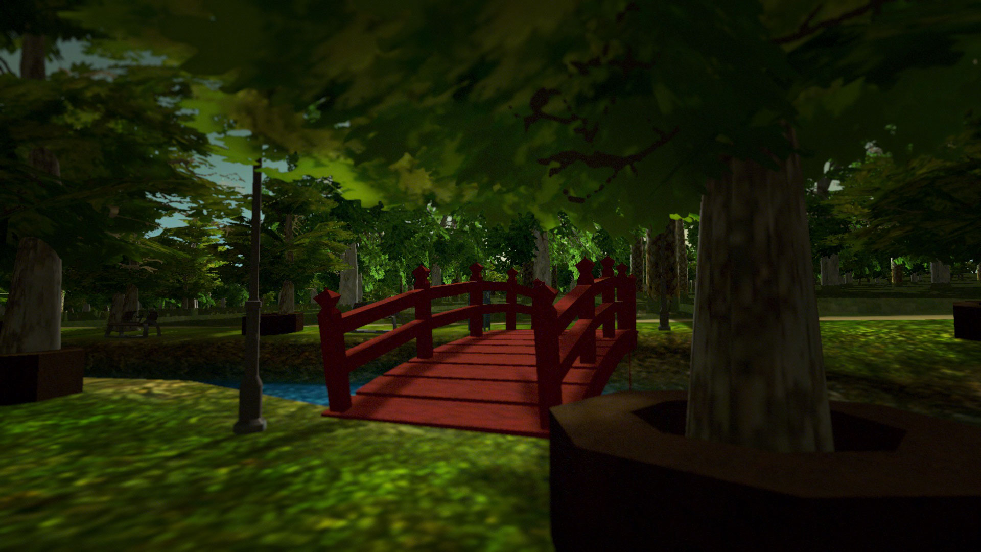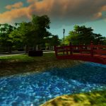 A small creek (5×2) surrounded by trees and benches and a bridge.