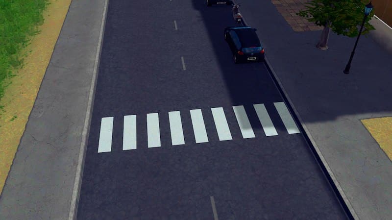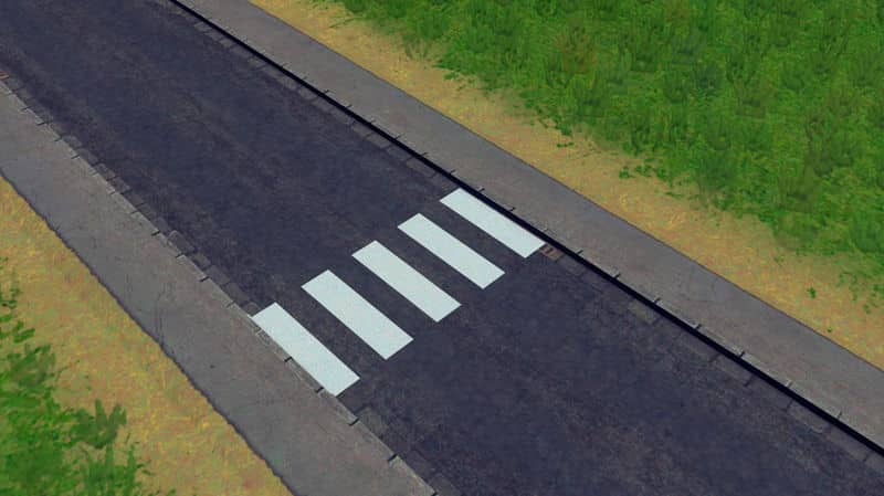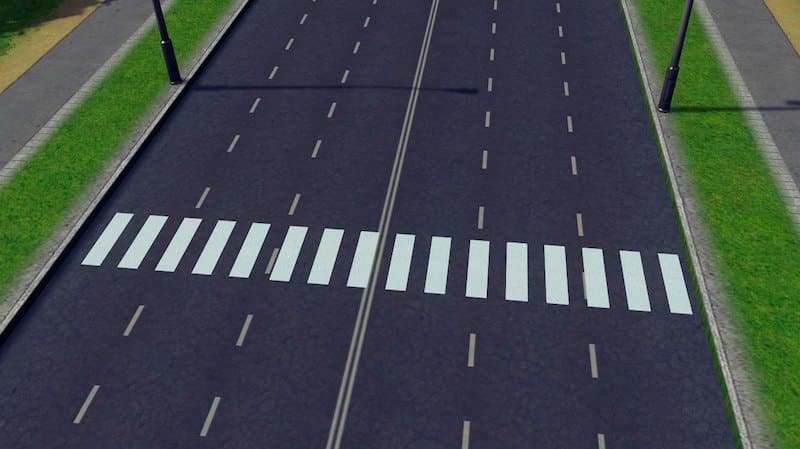 A crossing decal made to fit the tiny roads from NExt and up. These are only visual, cims won’t actually cross them unless the road has a crossing point there. They’re intended for those road textures without crossing markers or with Road Options.