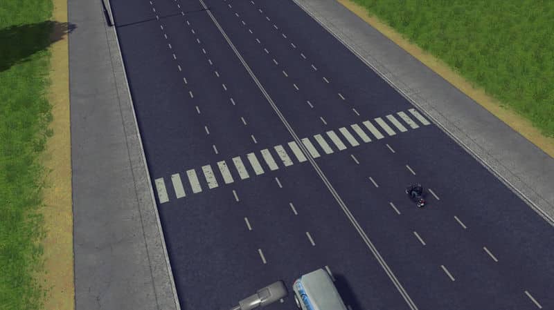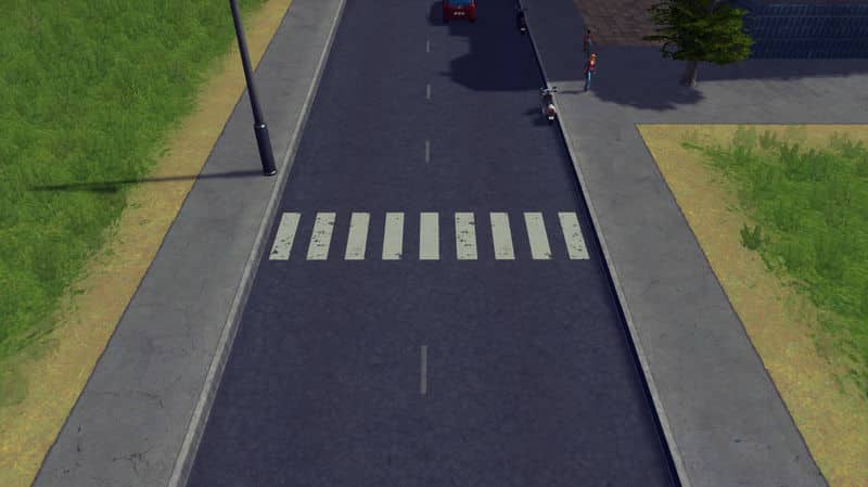 A worn crossing decal made to fit the tiny roads from NExt and up. These are only visual, cims won’t actually cross them unless the road has a crossing point there. They’re intended for those road textures without crossing markers or with Road Options.