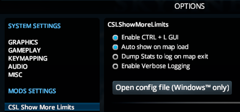 Configuation File Location: %SkylinesInstallFolder%CSLShowMoreLimites_Config.xml