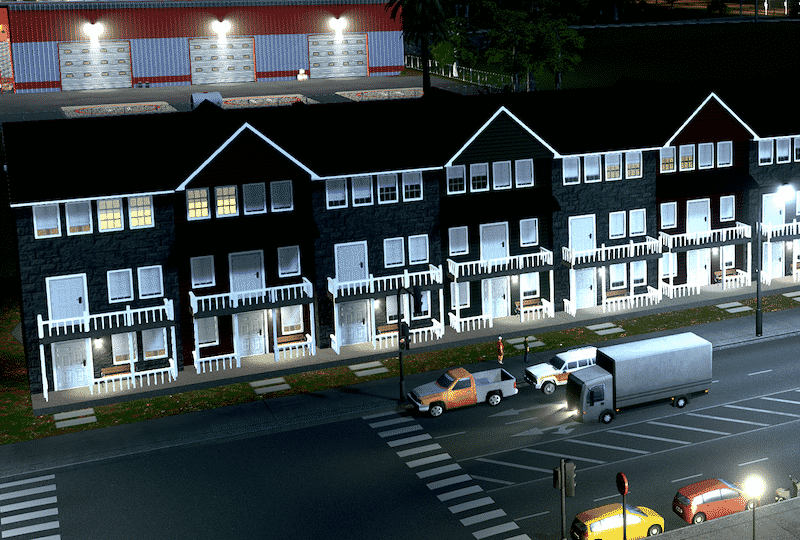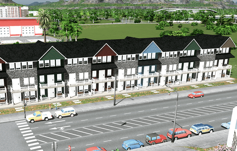 4 story townhouse with stone and siding for suburban areas and subdivisions. I created this a while ago and I’m in the process now of cleaning out my folders and revisiting stalled and unfinished projects before I start anything new. I’m not 100% satisfied with the model so there won’t be any further variations of this particular one.