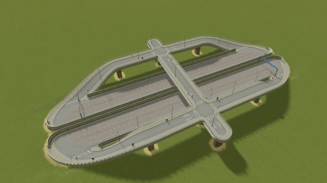 Danish style freeway offramps with road bridge. The road crossing can be upgraded for more heavy loads.