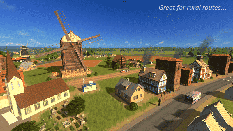 Less than half the size of a ‘bendy bus’, the Dart RH slips quickly through busy junctions and along narrow side streets. Cheap to buy and cheap to run, the Dart carries up to 30 passengers in full comfort (vanilla game bus = 80).