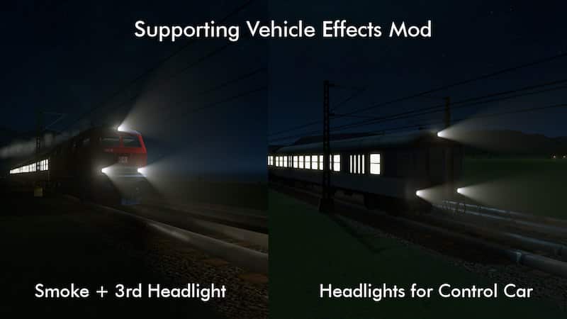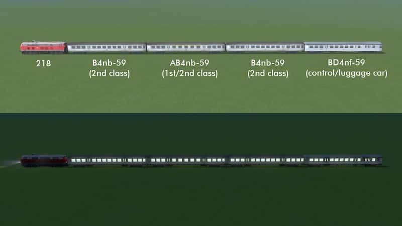 Destination signs reflect line color. Support for Vehicle Effects mod (optional), enabling diesel smoke and sound, a third headlight for the engine and direction-dependent headlights for the control car.