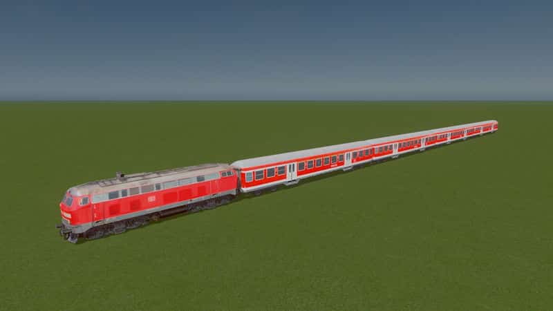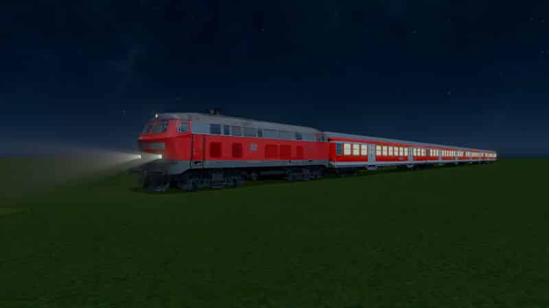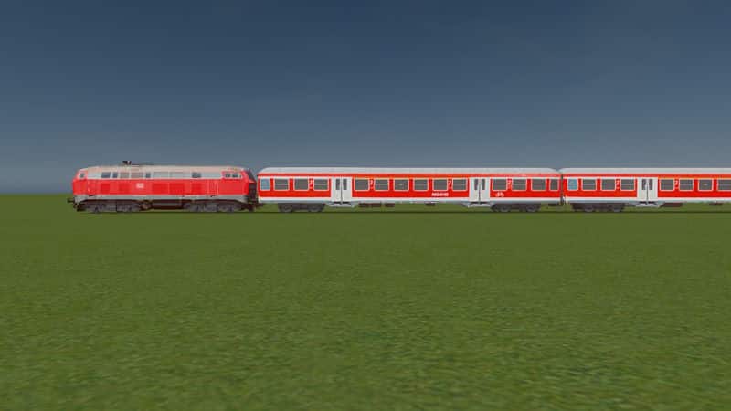 German class 218 diesel-hydraulic engine with four regional trailers (n-Wagen) in traffic red livery.