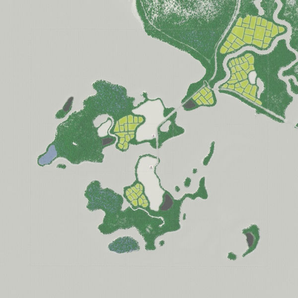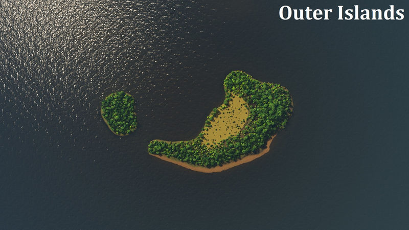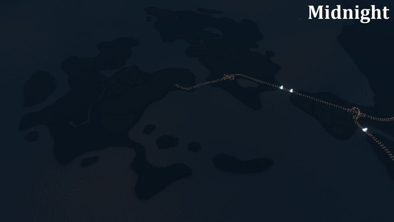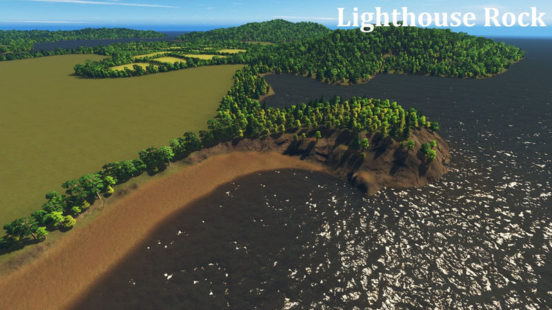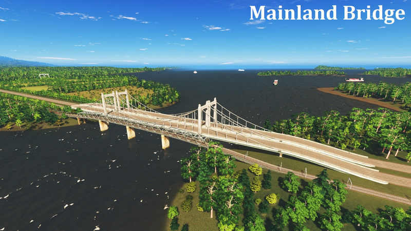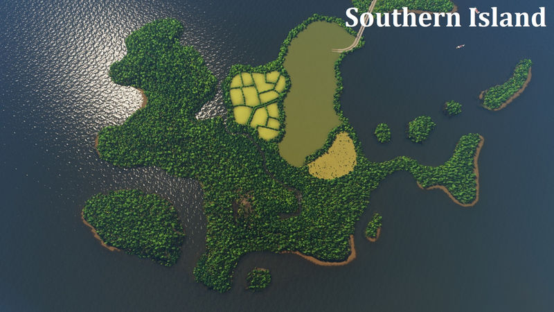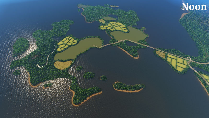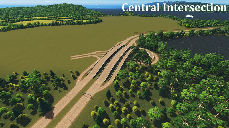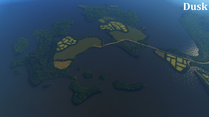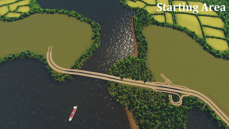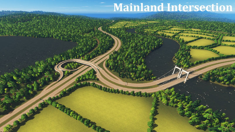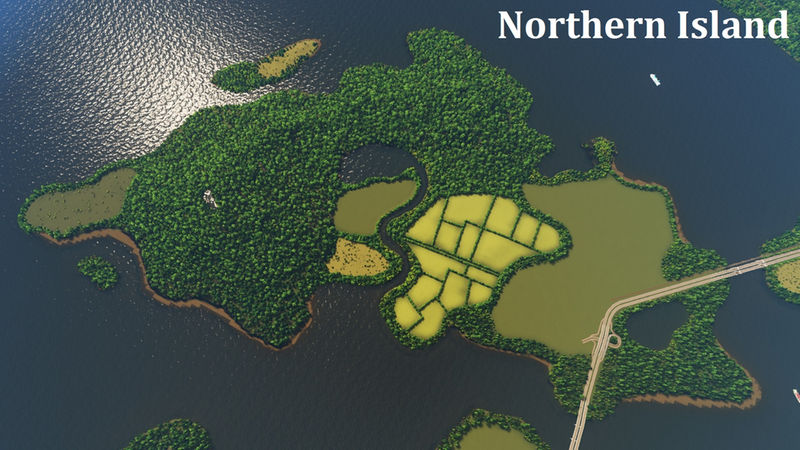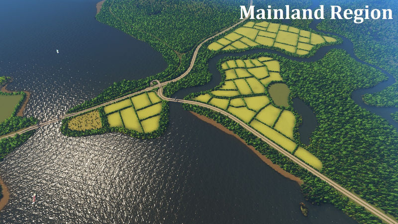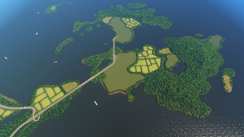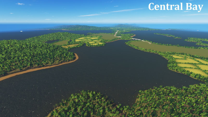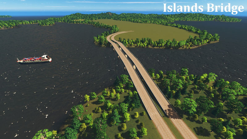 There are two rail and two highway connections coming in from the mainland, and they fuse before entering the islands. There are a ton of ship routes, which I haven’t tested for dense traffic, but all islands should have access to these routes. The empty green areas without trees are completely flat at a height of 60. There should be enough room for an airport, but space is scarse so you should plan ahead.
