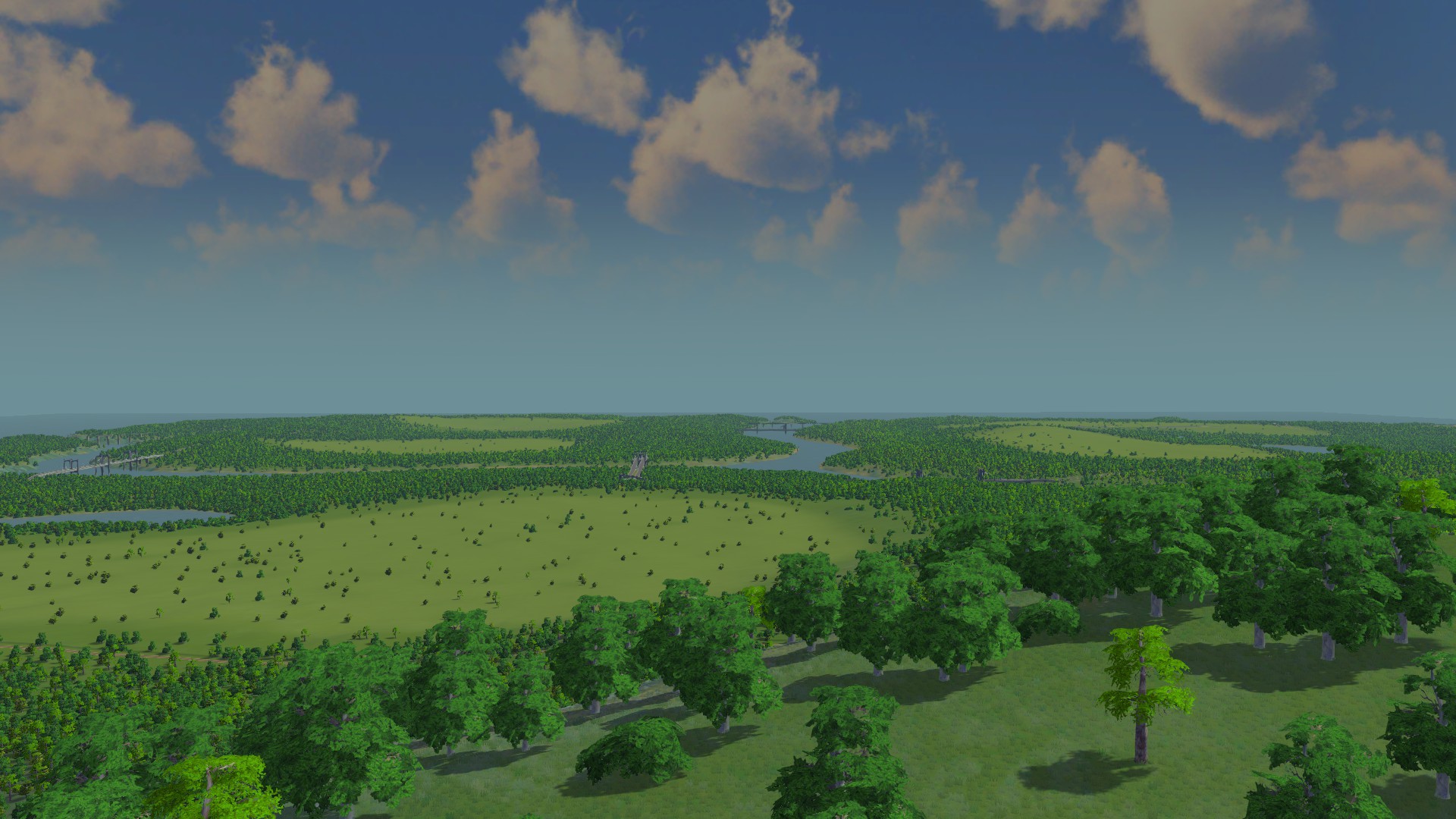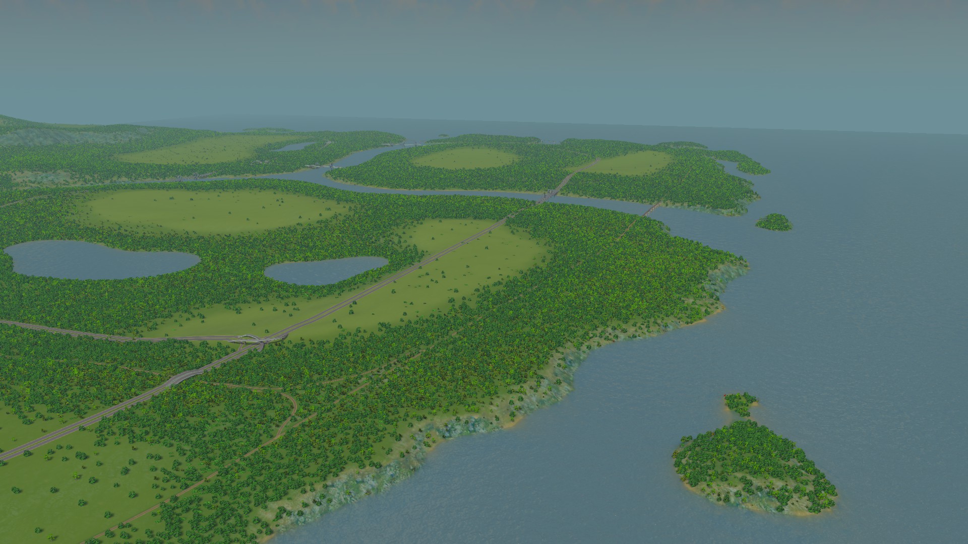 One massive island, one medium sized triangular island, and five smaller islands for landmarks or utilities. The map has a decent location for a dam. The main island is quite hilly. All industrial resources are available. There are also three small lakes.