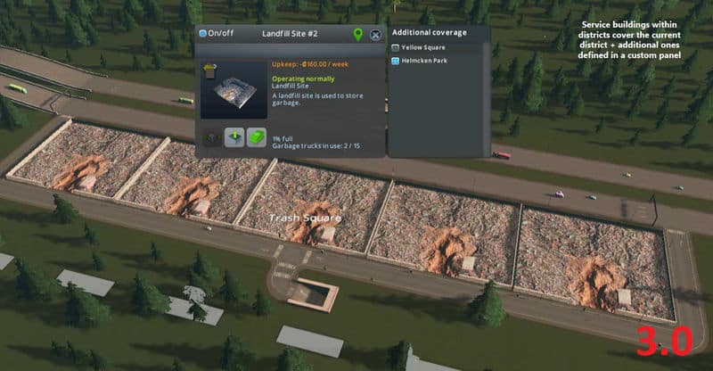 This mod works in a simple way: if your service building is part of a district, it will only serve the buildings within that same district. In case it’s outside a district it will work as usual, servicing everybody. If the service building needs emptying (landfill, cemetery, etc), then it may use either buildings of the current district or buildings that do not belong to any district. On top of that, additional districts may be configured per building in case you think it can handle the demand.